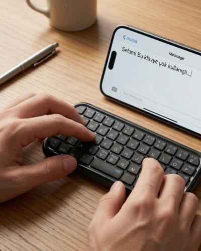 Taşınabilir mini bluetooth klavye, telefon ve tabletlerle pratik yazı yazma deneyimi sunan kompakt bir kablosuz klavyedir. Bluetooth bağlantısı sayesinde cihazınıza hızlı şekilde bağlanarak kablosuz kullanım sağlar.