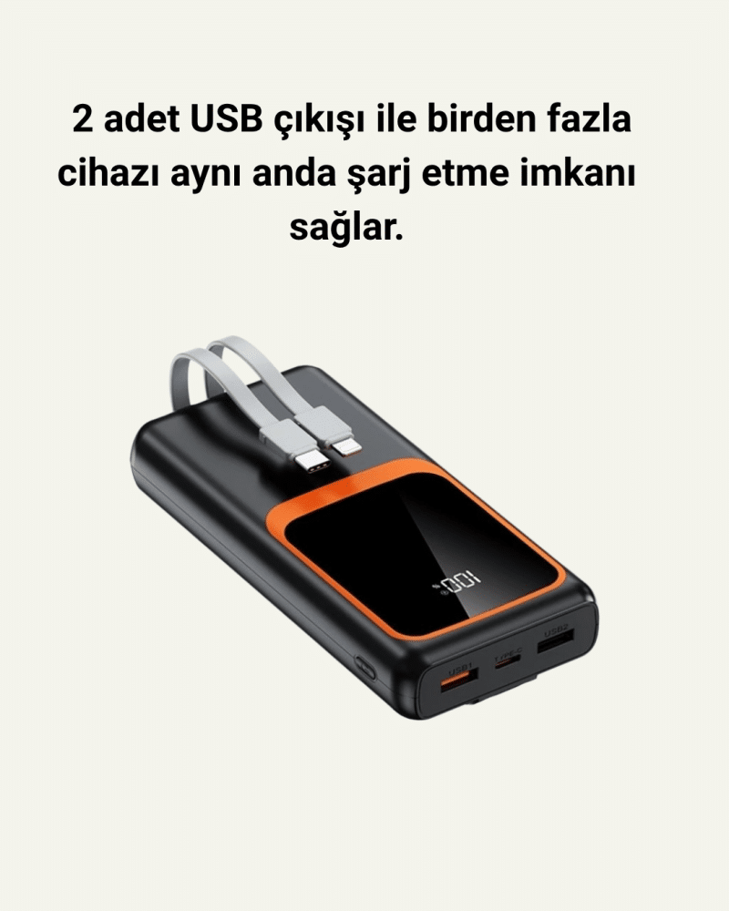 Yüksek kapasiteli 20000 mAh powerbank ile gün boyu kesintisiz enerji! 22.5W hızlı şarj desteği sayesinde cihazlarınızı çok daha kısa sürede şarj eder. Üzerindeki dijital ekran ile kalan şarj seviyesini anlık olarak görebilirsiniz. Çok kablolu yapısı sayesinde ekstra kablo taşımanıza gerek kalmaz. Hem pratik hem güçlü!