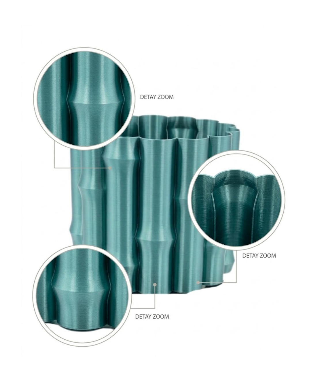 Ürünün yüzeyinde yer alan özel form detayları, klasik vazolardan farklı olarak daha modern ve özgün bir görünüm sunar. Dalgalı yapı, ışıkla birlikte hareket hissi yaratarak ürüne derinlik kazandırır. Parlak yeşil renk tonu ise doğayı çağrıştıran ferah bir atmosfer oluşturur.