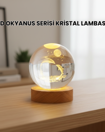 Kristal küre içerisinde yer alan 3 boyutlu yunus deseni, yüksek çözünürlüklü lazer işçiliği ile üretilmiş olup ışık yandığında derinlik hissi oluşturur. Ahşap taban, kristal küreyle mükemmel uyum sağlayarak modern ve doğal bir görünüm sunar. Hem dekoratif obje hem de gece lambası olarak kullanılabilir.