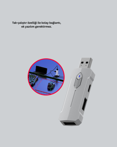 Mobil oyunlarda masaüstü deneyimi yaşamak isteyenler için tasarlanan bu 5’i 1 arada oyun seti, klavye, mouse ve dönüştürücüden oluşur. Özellikle battle royale ve FPS oyunları için kusursuz performans sunar. Yüksek hassasiyetli tuşlar, hızlı komut girişleri ve yüksek DPI destekli mouse sayesinde oyunda her hamleniz avantaj sağlar. Bluetooth 5.3 teknolojisi ile donatılan set, düşük gecikme süresiyle komutlarınızı anında işler. Dönüştürücü,Android cihazlarla tam uyumludur, böylece cihaz fark etmeksizin kolay kullanım sunar. Ergonomik tasarımı sayesinde uzun süreli oyun seanslarında bilek ve el yorgunluğunu azaltır. Dayanıklı malzemelerden üretilmiş olup, uzun ömürlü bir kullanım vadeder. Taşınabilir yapısı sayesinde istediğiniz her yere kolayca götürebilir ve oyun keyfini kesintisiz sürdürebilirsiniz.