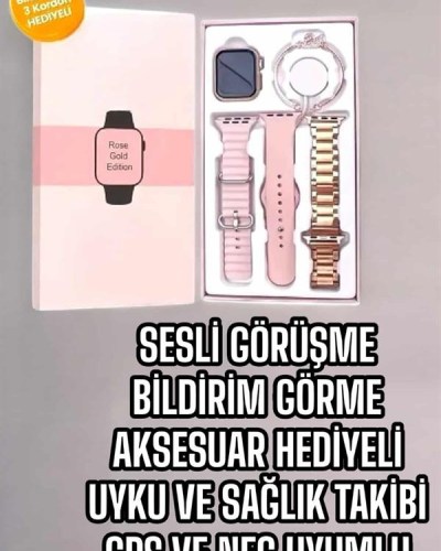 Şıklığı ve işlevselliği bir araya getiren bu akıllı saat, aksesuar severler için üç farklı kordon seçeneği ve zarif bir flamingo Bileklik ve yüzük  hediyesiyle birlikte gelir. Kordon seçenekleri arasında çelik metal, ocean tasarım ve silikon malzeme yer alır; böylece saatinizi günlük tarzınıza veya etkinliğinize göre uyarlayabilirsiniz. Hediye kolye, şık bir dokunuş ekler ve bu ürünü sadece teknolojik bir cihaz değil, aynı zamanda zarif bir aksesuar haline getirir. Saatin kapsamlı özellikleri ve kullanıcıya sunduğu hediyeler, hem fonksiyonel hem de estetik bir deneyim sunar.