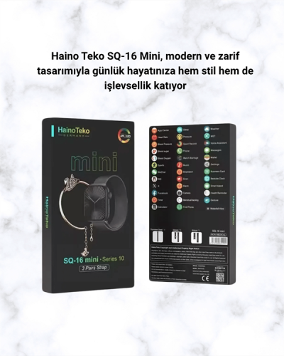 SQ-16 Mini Series 10, tüm akıllı telefonlarla uyumlu yapısı ve kullanıcı dostu arayüzü ile öne çıkar. Manyetik şarj kablosu sayesinde kolay şarj imkanı sunar. Su sıçramalarına karşı dayanıklıdır ancak yüzme veya duş sırasında kullanılması önerilmez. Günlük yaşamda rahatlıkla kullanılabilecek pratik bir akıllı saat deneyimi sunar.