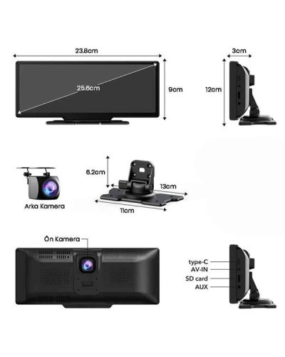 10.26 inçlik geniş ve yüksek çözünürlüklü 4K hassas dokunmatik ekranıyla sürüş keyfini yeni bir boyuta taşıyan bu kablosuz CarPlay ekran, hem konforu hem de güvenliği bir araya getiriyor. iOS ve Android cihazlarla uyumlu olan bu sistem, karmaşık kablo tesisatına ya da araç orijinalliğini bozacak işlemlere gerek kalmadan doğrudan entegre edilebilir. Sadece 12V çakmaklık soketine takılarak saniyeler içinde kullanıma hazır hale gelir; ekstra profesyonel destek gerekmeden herkesin rahatlıkla kurabileceği bir yapıya sahiptir.Cihazla birlikte gelen ön ve arka kameralar sayesinde yalnızca bir multimedya ekranı değil, aynı zamanda kapsamlı bir güvenlik çözümü de sunar. Araç içi ve dışı görüntüleri kaydeden bu sistem, olası kaza durumlarında güvenliğinizi belgelemek için büyük avantaj sağlar. Döngüsel kayıt teknolojisi sayesinde hafıza kartı dolduğunda en eski kayıtlar otomatik olarak silinir ve yeni görüntüler için yer açılır — bu da kullanıcıya zaman kazandıran pratik bir detaydır.Kablosuz CarPlay ve Android Auto desteği sayesinde haritalar, müzik uygulamaları, telefon aramaları gibi işlevlere kolayca erişebilir; aynı zamanda ekran yansıtma özelliği ile telefonunuzdaki videoları doğrudan ekranda izleyebilirsiniz. Cihaz, FM verici veya Aux çıkışı ile araç hoparlör sisteminize kolayca bağlanabilir, böylece ses kalitesinden ödün vermeden içeriklerinizin keyfini çıkarabilirsiniz.Modern araç kullanıcılarının beklentilerine yanıt veren bu CarPlay ekran, hem teknolojik hem de kullanıcı dostu yapısıyla öne çıkar. Sürüş sırasında dikkat dağıtmadan daha bilinçli kararlar almanızı sağlar, seyahatlerinizi eğlenceli ve güvenli hale getirir.