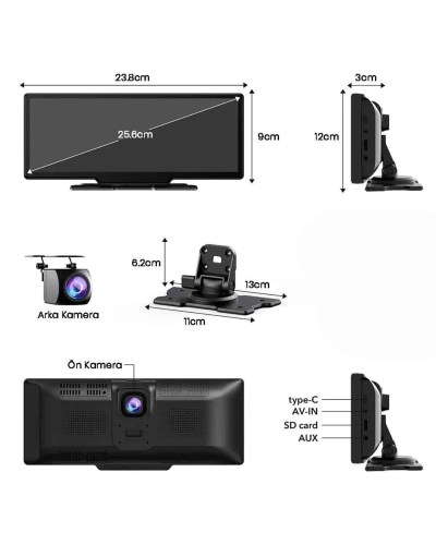 4K 10.2 İnç Çift Kameralı Araç Multimedya Ekranı CarPlay Kablosuz Tüm Cihazlara Uyumlu