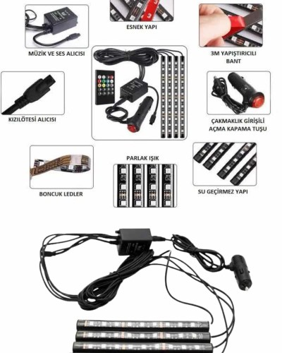 Aracınızın iç mekanında hem şıklığı hem de konforu artırmak isteyenler için tasarlanan bu 12 LED’li RGB şerit aydınlatma seti, sesle senkronize çalışan yapısı sayesinde müzikle uyum içinde yanarak etkileyici bir atmosfer oluşturur. Her biri 12 adet güçlü 5050 SMD LED barındıran 4 esnek şerit, 3M yapışkan bantları sayesinde aracınızın ayak altı gibi stratejik noktalarına kolayca monte edilir. Uzaktan kumanda ile kontrol edilen bu sistemde 8 farklı renk modu, 4 müzik senkronizasyon seçeneği, 2 geçiş efekti ve parlaklık ayarı gibi birçok özelliğe kolayca erişebilirsiniz. 12V elektrik sistemiyle çalışan ürün, tüm binek araçlarla uyumludur ve çakmaklık soketiyle kolayca çalıştırılır. Su sıçramalarına karşı dayanıklı IP5 koruma derecesi, uzun süreli ve güvenli kullanım sağlar. 1,2 m ve 1,7 m uzunluğundaki kablolar sayesinde LED şeritleri dilediğiniz noktaya rahatlıkla konumlandırabilirsiniz. Estetik ve fonksiyonelliği bir arada sunan bu set, araç içi ambiyansınızı benzersiz hale getirmenin pratik bir yoludur.