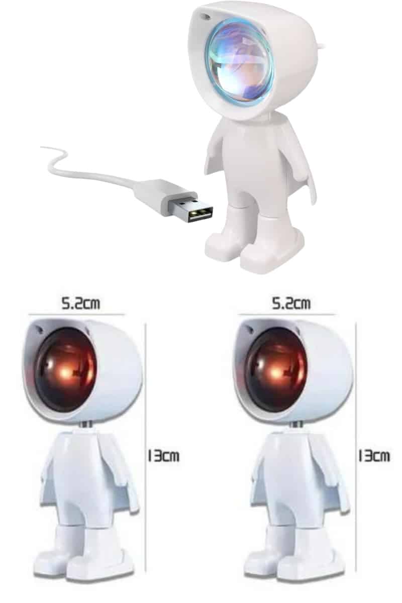 Gün batımı efektli bu şarjlı lamba, sevimli astronot tasarımı ile dikkat çeken hem işlevsel hem de dekoratif bir aydınlatma çözümüdür. LED ışık kaynağı sayesinde loş, yumuşak ve sıcak bir aydınlatma sunar; böylece ortamda huzurlu ve sakin bir atmosfer yaratır. Özellikle yatak odası, oturma odası ya da çalışma alanları gibi kişisel yaşam alanlarında hem gece lambası hem de ortam ışığı olarak rahatlıkla kullanılabilir.