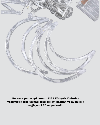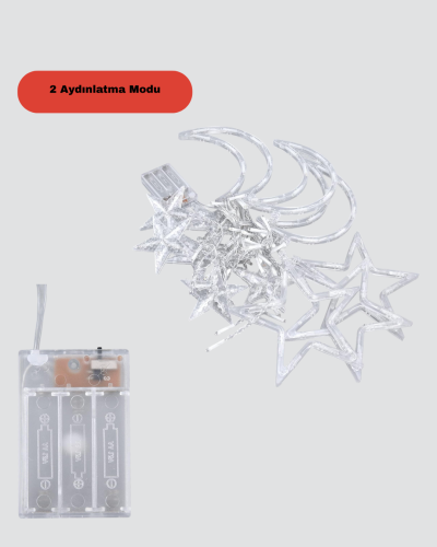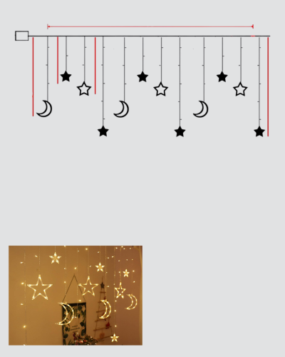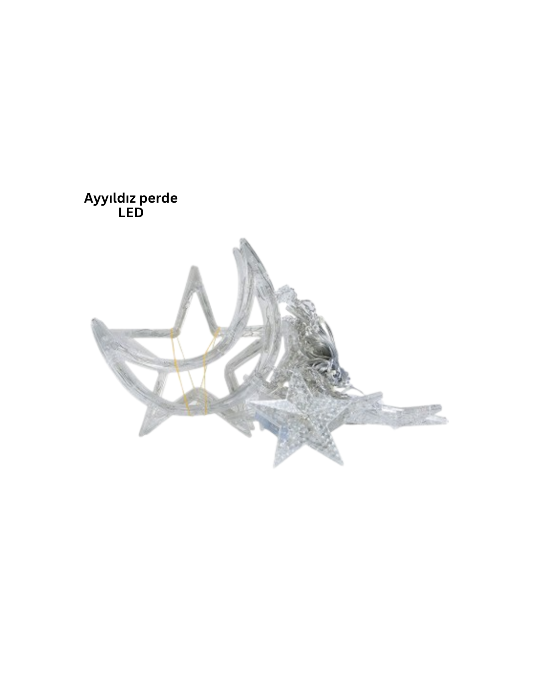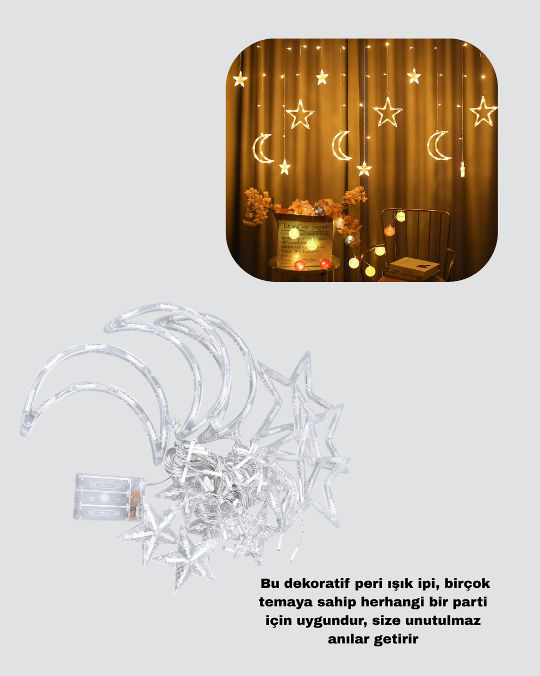 Dekoratif yıldız ay şekilli pilli perde led aydınlatma, estetik tasarımı ve pratik kullanımı ile dikkat çeker. Yumuşak ışık yayılımı sayesinde bulunduğu ortamda huzurlu ve romantik bir atmosfer oluşturur.