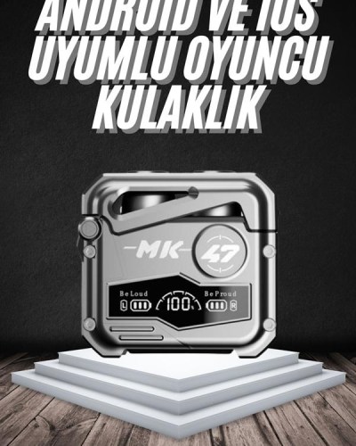 Gerçek Kablosuz ÖzgürlükMK47 Bluetooth kulaklık, dokunmatik kontrol özelliği ile kullanımı son derece kolay hale getirir. Cep telefonu oyuncuları için özel olarak optimize edilen bu kulaklık, ultra düşük gecikme süresiyle oyun deneyiminizi zirveye taşır. Kulaklıkları şarj kutusundan çıkardığınız anda otomatik olarak telefonunuzla eşleşir, böylece hiçbir anı kaçırmazsınız.Kristal Netliğinde 3D Ses ve Aktif Gürültü EngellemeTaşınabilir medya oynatıcı, mobil cihaz veya oyun konsolu ile uyumlu olan MK47, güçlü 3D ses teknolojisiyle sizi oyunun ya da müziğin tam ortasına taşır. Aktif gürültü iptali özelliği sayesinde dış ortam seslerini izole eder. Farklı boyutlarda sunulan kulak tıkaçları sayesinde kulaklığınız sabit kalır ve konforlu bir kullanım sunar – ister spor yapın ister günlük yürüyüşlerinizde kullanın.Güçlü Pil Performansı ve IPX5 Su DirenciKulaklıklar tek bir şarjla 4-5 saat kesintisiz kullanım sunar. 400mAh kapasiteli şarj kutusu ise kulaklıklarınızı birkaç kez yeniden şarj edebilir. Type-C şarj portu sayesinde hızlı ve pratik şekilde şarj olur. IPX5 su geçirmezlik derecesi ile yağmura ve tere karşı dayanıklıdır – dış mekan kullanımı için ideal bir seçenektir.