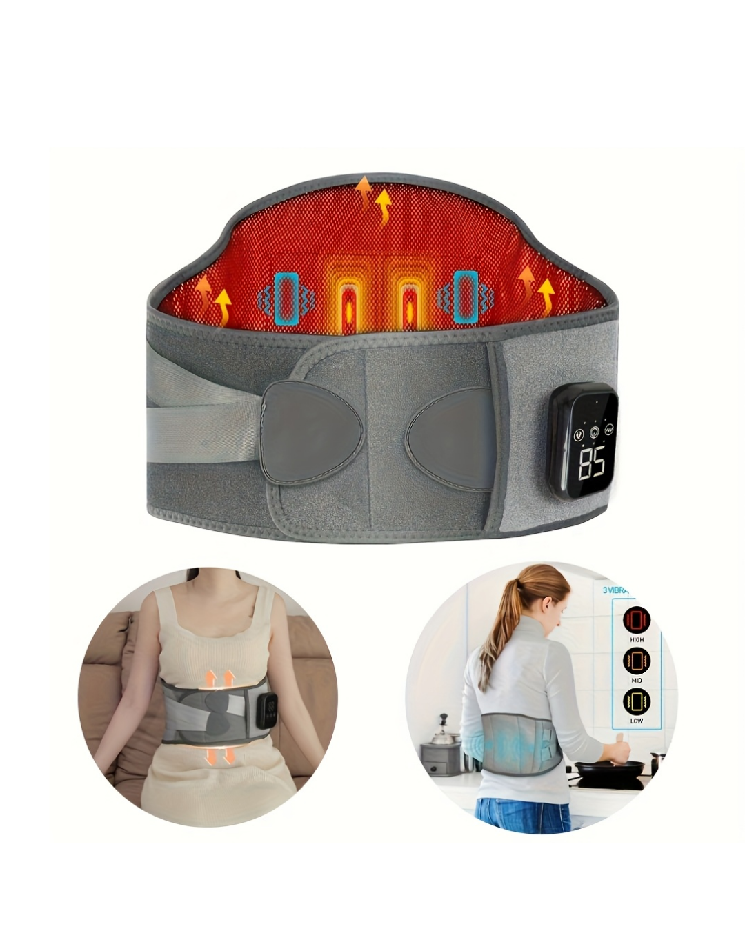 Sıcaklık ve titreşim kombinasyonu sunan bu bel kemeri, konfor odaklı tasarlanmıştır. Üç farklı ısı seviyesi ile kontrollü kullanım sağlar.