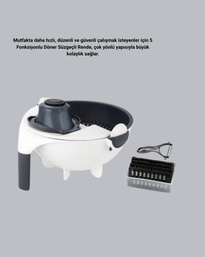 Bu 5 fonksiyonlu döner rende, mutfakta pratiklik ve düzen arayan herkes için vazgeçilmez bir araçtır.
