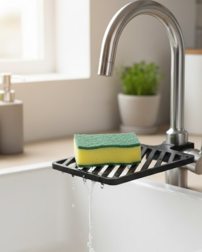 Damlama tepsili musluk sünger tutucu, mutfak süngerinin ıslak kalmasını önleyerek daha hijyenik bir kullanım sunar. Sünger, musluğa entegre edilen tepsi üzerinde durur ve yıkama sonrası akan su doğrudan evyeye yönlendirilir. Böylece tezgâh üzerinde su birikmez ve mutfak daha temiz kalır.