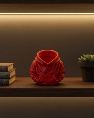 Hoodie tasarımlı kırmızı kalemlik, modern ve genç tarzı ile masa düzenine farklı bir bakış kazandırır. 10×10 cm ölçüsü sayesinde kompakt bir kullanım sunar ve masa üzerinde düzen oluşturur. Kalemler, not kağıtları ve küçük masaüstü ürünleri için pratik bir saklama alanı sağlar.