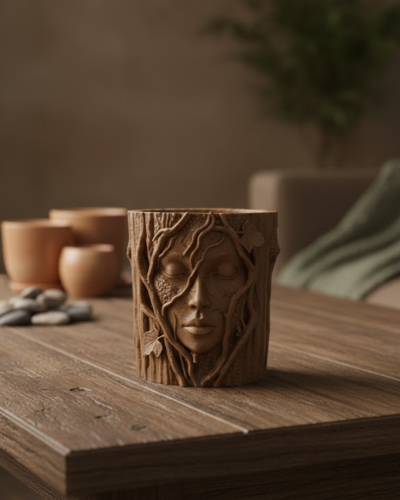 Sanat ile doğanın büyüleyici uyumunu bir araya getiren bu yüz detaylı dekoratif vazo, yaşam alanlarınıza mistik ve etkileyici bir atmosfer kazandırır. Ağaç gövdesi formu içine işlenmiş huzurlu yüz figürü, doğanın ruhunu temsil ederken bulunduğu ortama sanatsal bir derinlik katar. İnce işlenmiş sarmaşık ve yaprak detayları, ürüne üç boyutlu ve heykelsi bir görünüm kazandırır.