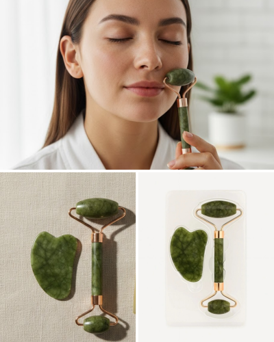 Doğal yeşim taşından üretilmiş 2 parçalı yüz masaj seti, cilt bakım rutininizi desteklemek ve daha canlı bir görünüm elde etmenize yardımcı olmak amacıyla tasarlanmıştır. Set içerisinde çift başlıklı yeşim roller ve gua sha taşı bulunmaktadır. Doğal jade stone yapısı sayesinde cilt üzerinde serinletici ve rahatlatıcı bir his oluşturur.