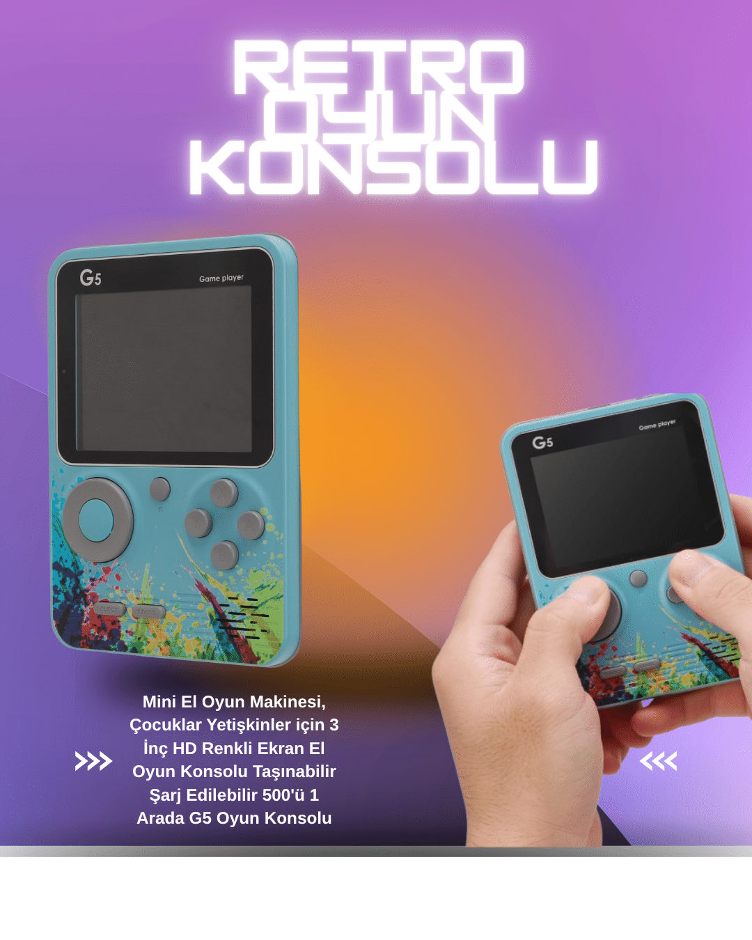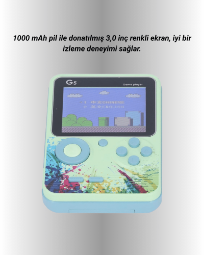 USB kablo ile şarj edilen dahili bataryası, tek şarjla uzun süreli kullanım sağlar. Elektrik bağımlılığı olmadan özgürce oyun oynayabilirsiniz. Dayanıklı plastik kasası, düşmelere ve çizilmelere karşı dirençlidir. G5 Game Box, hem geçmişin oyunlarını yaşatmak isteyen yetişkinler hem de keşfetmeye hevesli çocuklar için eğlenceli, kullanışlı ve duygusal değeri yüksek bir cihazdır.