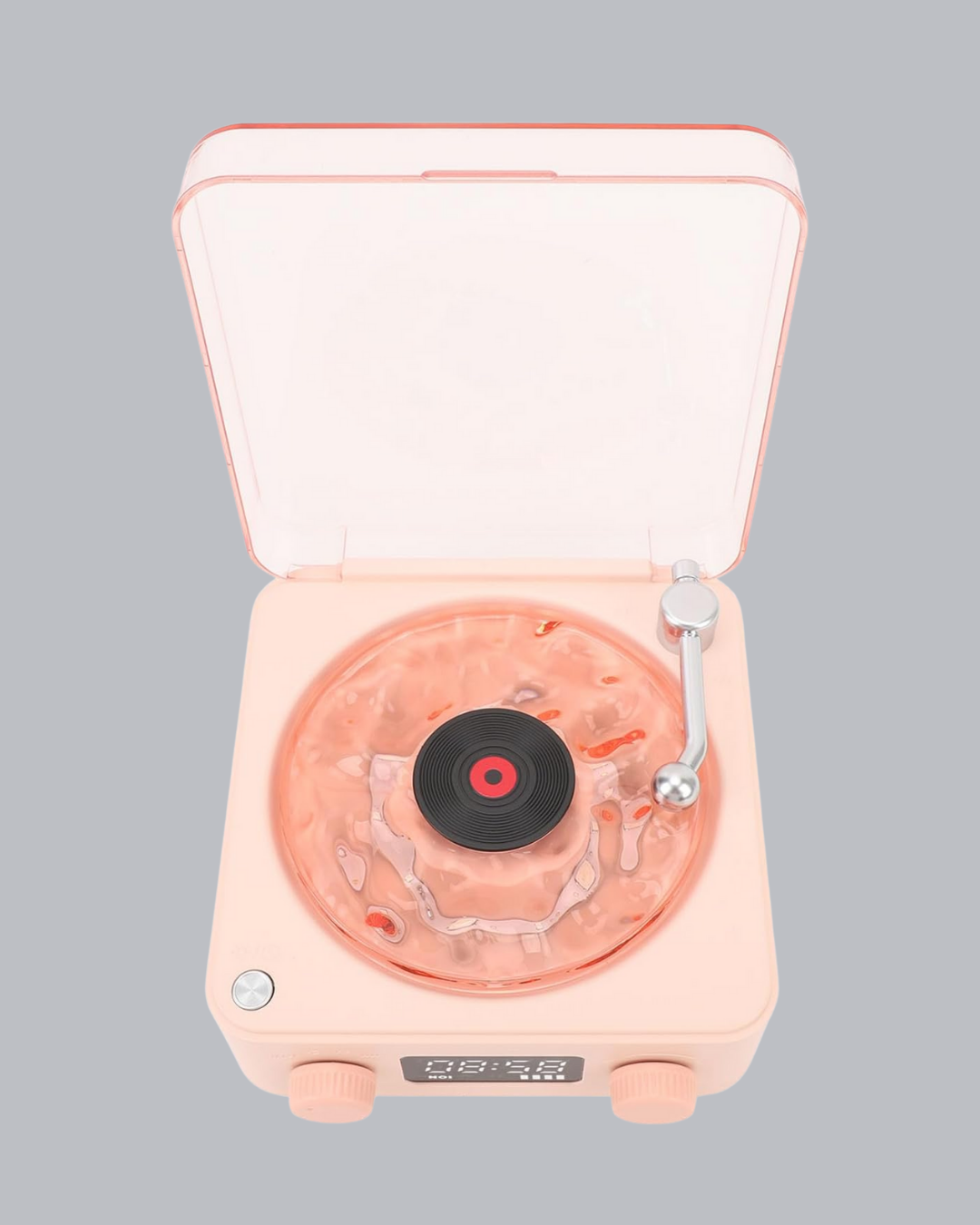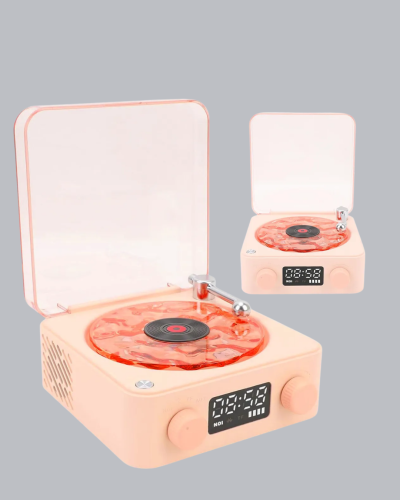 Vintage plak çalarlardan ilham alınarak tasarlanan modern gövdesi, ürüne nostaljik ama şık bir karakter kazandırır. Şeffaf yüzeyindeki ışık efektleri ve minimalist formu, oturma odası, yatak odası, ofis veya çalışma masası gibi alanlara dekoratif bir değer katar. Hafif ve taşınabilir yapısı sayesinde istediğiniz her yere kolayca götürebilir, tek cihazla çok yönlü kullanım avantajı elde edebilirsiniz.