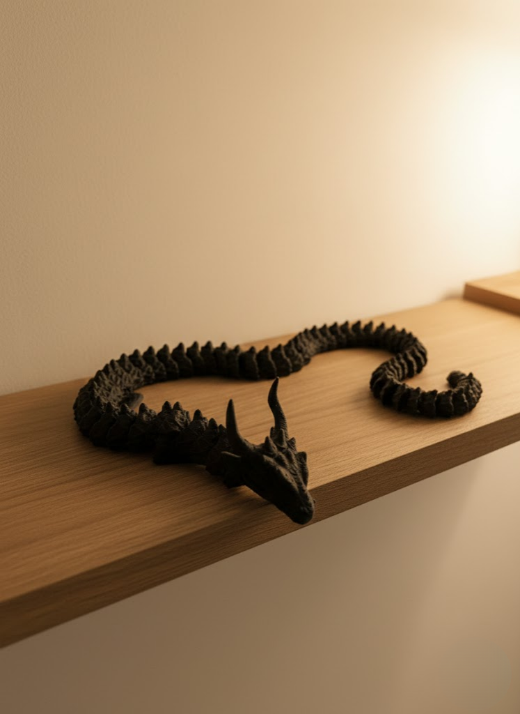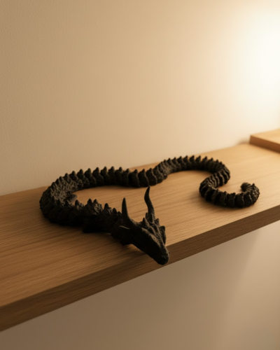 Hareketli Siyah Ejderha Figürü, uzun ve detaylı gövde yapısıyla güçlü bir görsel etki oluşturur. 60 cm uzunluğundaki tasarımı, ürünü sıradan masa figürlerinden ayırarak daha dikkat çekici hale getirir. Eklemli yapısı sayesinde ejderhanın gövdesi kıvrılabilir, farklı pozisyonlar verilerek dekorasyon tarzına göre şekillendirilebilir.