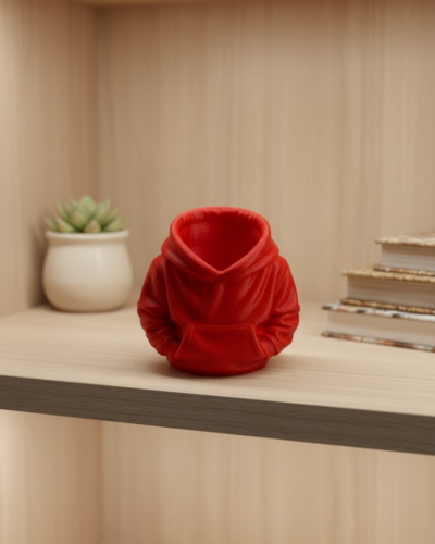 Kırmızı hoodie kalemlik, masa üstü düzenini sağlarken dekoratif bir görünüm sunan eğlenceli bir aksesuardır. 10×10 cm ölçüsü ile masa, raf veya kitaplık üzerinde rahatlıkla kullanılabilir. Hoodie şeklindeki tasarımı, ürünü sıradan kalemliklerden ayırarak özgün bir stil ortaya koyar.