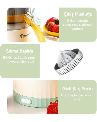 2 yıl ithalatçı garantisi ile güvenle kullanım sunar, olası teknik sorunlarda endişe etmenize gerek kalmaz Modern tasarımı ve şık görünümüyle mutfak dekorasyonunuza estetik bir dokunuş katar Güvenlik kilidi özelliği sayesinde çocukların ve evcil hayvanların kazara kullanımını önler, güvenli bir kullanım sağlar 2000 watt ve altı güç tüketimi ile enerji verimliliği sunar, elektrik faturalarınızda tasarruf etmenize yardımcı olur Katı meyve sıkacağı modeli, meyve ve sebzelerinizi kolayca sıkarak sağlıklı içecekler hazırlamanızı sağlar Dayanıklı plastik materyali ile uzun ömürlü kullanım vaat eder ve temizliği kolaydır USB Şarj Edilebilir Taşınabilir Mini Meyve Sıkacağı Özellikler: Voltaj: 7.4V Güç: 45W Şarj USB şarjı Ambalaj boyutu: 138*112*237*5mm Kesici kafa tipi: çift kesici Tortu kutusu kapasitesi: 500ml’nin altında (500ml dahil) Güç: 200W Meyve sıkacağı maksimum hızı: 18000 rpm Gövde Malzemesi: Plastik Bir seferde maksimum Kapasite: 400 mL Ek özellikler: şarj edilebilir ve taşınabilir