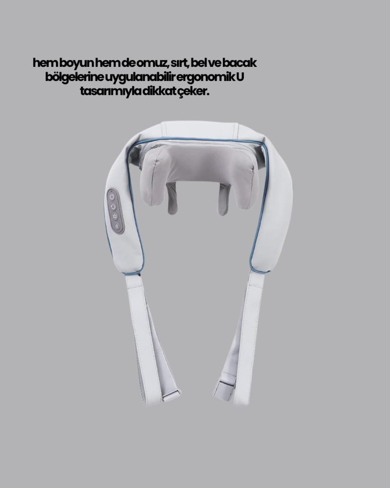 titreşimli boyun masaj cihazı, günün stresini ve kaslarda biriken yorgunluğu ortadan kaldırmak için tasarlanmış çok yönlü bir masaj ürünüdür. Ergonomik U şeklindeki gövdesi, yalnızca boyun bölgesini değil; omuz, sırt, bel ve bacak kaslarını da kapsayan geniş uygulama alanı sunar. Şık gri renk tasarımı ve hafif yapısı ile hem modern hem de pratik bir kullanım sağlar.