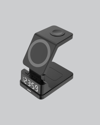 Bu kablosuz şarj istasyonu; hızlı şarj, LED dijital saat ve zarif masa aksesuarı olarak tasarlandı.