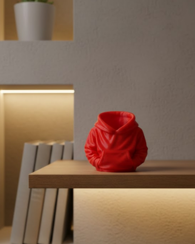 Kırmızı hoodie kalemlik, canlı rengi ve eğlenceli tasarımıyla masa üstlerine enerjik bir hava kazandırmak için tasarlanmıştır. 10×10 cm ölçüsü sayesinde masa üzerinde fazla yer kaplamadan kalem, silgi ve küçük ofis malzemelerini düzenli şekilde saklamaya yardımcı olur. Hoodie formu, ürünü klasik kalemliklerden ayırarak dikkat çekici bir görünüm sunar.