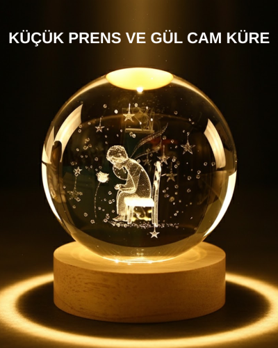 8 cm büyük boy cam küre, dekoratif boyutuyla bulunduğu ortamda güçlü bir görsel etki yaratır. Üst kısmı tamamen camdan üretilmiş olup ışığı yumuşak şekilde dağıtır. Alt kısmı ahşap malzemeden üretildiği için doğal bir görünüm sunar. Küçük Prens temalı tasarımı, özellikle modern, minimal ve nostaljik dekorasyon tarzlarıyla çok iyi uyum sağlar. Gece lambası olarak da kullanılabilir.