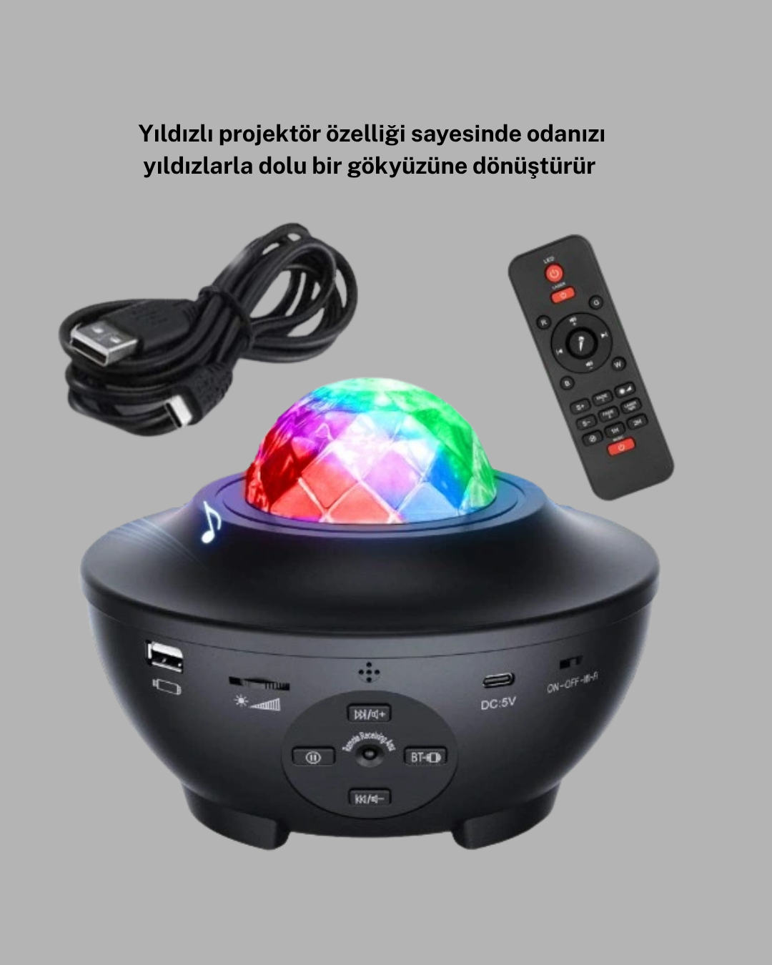 Yıldızlı projektör, evinizi gökyüzüyle buluşturan ve özel anlarınıza büyülü bir hava katan güçlü bir atmosfer aydınlatma cihazıdır. Yıldız efektleri ve galaksi görünümü sayesinde duvarlarda ve tavanda benzersiz bir görsel şölen oluşturur. Farklı renk seçenekleri ile odanın havasını saniyeler içinde değiştirebilir, ister huzurlu ister enerjik bir ambiyans yaratabilirsiniz.