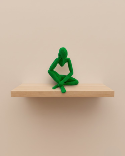 Yeşil insan figürü biblo, düşünceli pozuyla dekorasyona karakter katar. Küçük boyutları sayesinde dar alanlarda bile şık bir tamamlayıcı olarak kullanılabilir. Evde, ofiste veya çalışma alanlarında masa üstü ya da raf dekoru olarak tercih edilebilir. Minimal tasarımı, loş ya da aydınlık ortamlarda estetik bir duruş sergiler ve dekorasyona modern bir hava kazandırır.