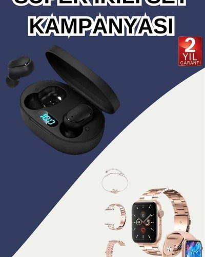 AKILLI SAATYeni Nesil Mini Kadın Akıllı Saat, şıklığı ve fonksiyonelliği bir araya getiren tasarımıyla kadınlar için ideal bir seçenek sunuyor. Almanya üretimi ultra dayanıklı model, özel wireless şarj özellikleriyle öne çıkıyor ve Türkçe menüsü sayesinde kullanıcı dostudur. Kutu içeriğinde, mini akıllı saat, 3 farklı kordon, hediye bileklik, wireless şarj kablosu ve kullanım kılavuzu bulunmaktadır. Şık pembe kutusu, hediye olarak tercih edilmesini sağlayan bir özellik taşır. 41 mm kavisli oval kenarlı yeni tasarımı ve 1,70 inç AMOLED ekranı ile yüksek çözünürlükte HD görüntü sağlar.Saat, nabız ölçer, uyku izleyici, kan basıncı, tansiyon, EKG ve vücut sıcaklığı ölçer gibi sağlık izleme özellikleriyle sağlığınızı takip etmenizi sağlar. 117 farklı spor modu ve adım, kalori, kalp ritmi ölçme gibi özellikler ile aktivite takibini oldukça detaylı yapabilirsiniz. Ayrıca akıllı hatırlatıcılar sayesinde su içme ve hareketsizlik gibi hatırlatmalar alabilir, tüm bildirimleri ve mesajları anında saatinizde görebilirsiniz.Bluetooth bağlantısı ile yüksek kaliteli müzik dinleyebilir ve uzaktan fotoğraf çekme özelliği ile fotoğraflarınızı kolayca çekebilirsiniz. Suya dayanıklı yapısı, günlük kullanımda sıklıkla tercih edilmesini sağlar; ancak deniz ve havuz gibi basınçlı suya karşı su geçirmez.Saatin sunduğu diğer özellikler arasında Türkçe ve çoklu dil desteği, saatimi bul, telefonumu bul, alarm, kronometre, hava durumu, hesap makinesi gibi fonksiyonlar bulunur. Kordonu değiştirilebilir, bu sayede kişisel tercihlere göre tasarımı özelleştirilebilir. 24 ay garanti süresi ile kullanıcılarına güvenli bir deneyim sunar.KULAKLIKKulak içi Bluetooth kulaklık, yüksek ses kalitesi ve stereo etkisi ile müzik ve görüşmelerde üstün bir deneyim sunar. Sadece 1 saatte tamamen şarj olan kablosuz kulaklık, hızlı şarj özelliği sayesinde vakitten tasarruf etmenizi sağlar. Siyah renkli tasarımı ve kulağa tam oturan yumuşak sünger detayları ile konforlu bir kullanım sunarken, 12 metre çalışma mesafesiyle 4 saat boyunca kesintisiz kullanım imkanı tanır.LED ışıklı uyarı sistemi sayesinde düşük pil, bağlantı durumu ve kullanım aşamaları hakkında kırmızı, yeşil ve mavi renklerle kullanıcıyı bilgilendirir. Terlemeye dayanıklı ve su geçirmez yapısı ile günlük aktivitelerinizde rahatlıkla kullanılabilir. Android ve iOS cihazlarla tam uyumlu olan bu kulaklık, açıldığında otomatik olarak bağlanarak kullanımı kolaylaştırır.Mini boyutları sayesinde çanta ve cepte kolayca taşınabilen kulaklık, tuşlu kontrol sistemi ile telefonunuza dokunmadan ses açma-kapama, gelen aramaları yanıtlama ve sonlandırma gibi işlemleri pratik bir şekilde yapmanızı sağlar. Lithium polymer bataryası ile 4 saat boyunca kesintisiz müzik keyfi sunan kulaklık, extra bass ve HD ses desteği ile yüksek kaliteli ses aktarımı gerçekleştirir. Çift mikrofonlu yapısı sayesinde net ve kesintisiz görüşmeler sağlarken, gürültü kesme özelliği sayesinde dış sesleri en aza indirerek daha berrak bir dinleme deneyimi sunar. 3D ses kalitesi ile gecikmeyi önleyerek yüksek performans sergileyen bu model, üstün özellikleriyle kullanıcılarına kaliteli ve konforlu bir kullanım imkanı sunuyor.