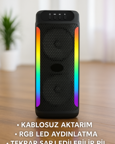 RGB ışıklı çift hoparlörlü taşınabilir Bluetooth hoparlör, hem güçlü ses kalitesi hem de şık tasarımıyla öne çıkar. 4 inçlik iki hoparlör, yüksek ses gücü ve etkileyici bas performansı sunar. Bluetooth teknolojisi sayesinde telefon, tablet veya bilgisayarınızla kablosuz olarak eşleşebilir. USB, SD kart ve AUX girişleri ile farklı müzik kaynaklarını kullanabilirsiniz. Dahili FM radyo fonksiyonu ile istediğiniz zaman radyo dinleyebilirsiniz. Ürünle birlikte gelen mikrofon, karaoke yapmanızı sağlar ve özel günlerinize renk katar. RGB ışıklar, müziğin ritmine uyum sağlayarak atmosferinizi zenginleştirir. Şarjlı bataryası, uzun süreli kablosuz kullanım imkanı sunar. Hafif ve taşınabilir yapısı ile her ortamda kolayca kullanılabilir. Dayanıklı malzemelerden üretilmiş gövdesi, uzun yıllar kullanım imkanı verir. Evde, açık havada veya seyahatte eğlenceli anlar yaşamak isteyen herkes için mükemmel bir tercihtir.