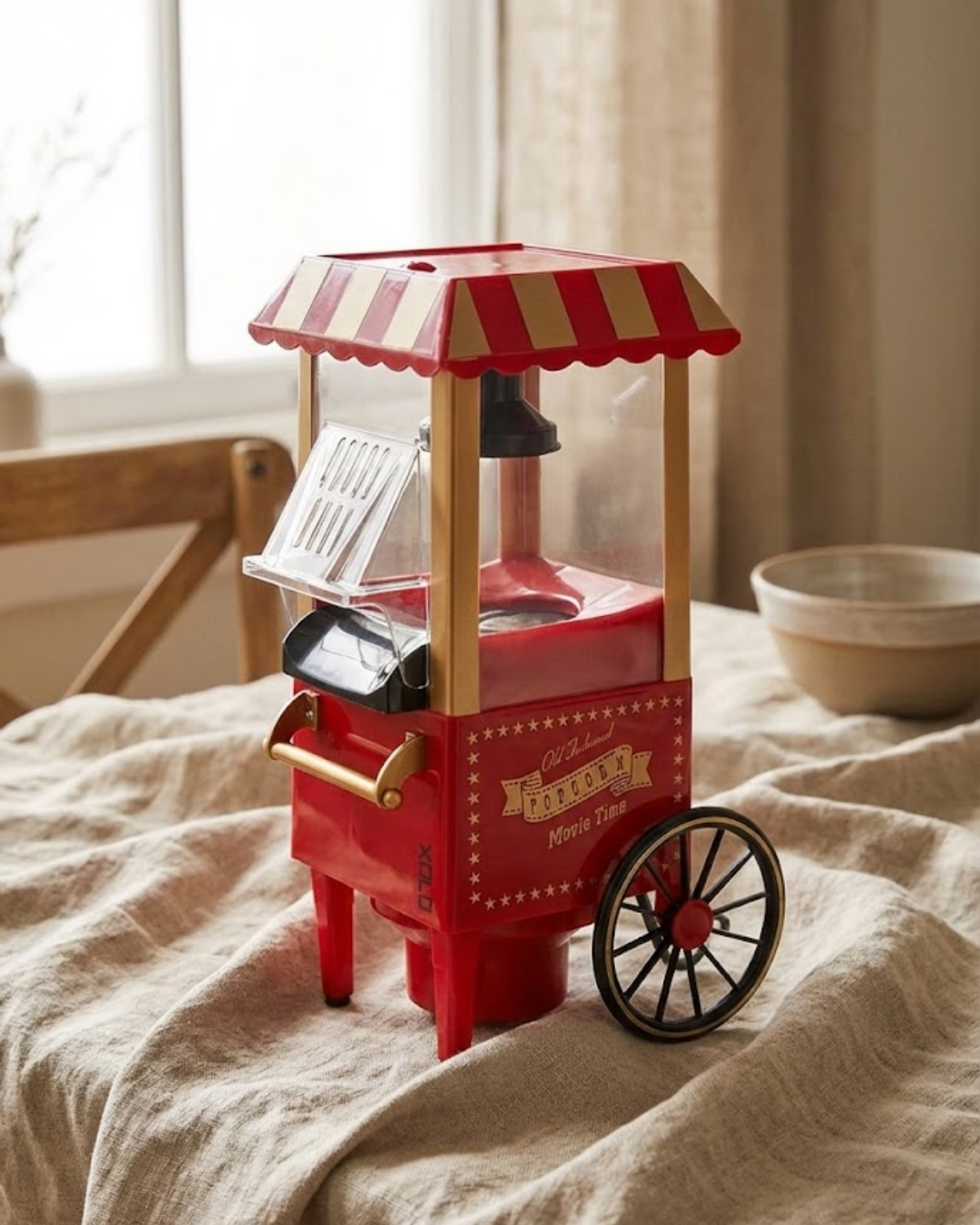 Nostaljik görünüme sahip bu yağsız popcorn makinesi, ailece keyifli anlar yaşamanız için tasarlanmıştır. Sıcak hava ile çalışan sistemi sayesinde yağ eklemeden mısır patlatır ve sağlıklı atıştırmalıklar sunar. Yapışmaz patlatma yüzeyi, mısırların eşit şekilde patlamasını sağlar.