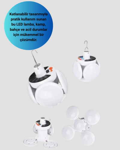 Pratik katlanabilir solar LED lamba, taşınabilir yapısı ve güçlü aydınlatma özelliği ile günlük yaşamda büyük kolaylık sağlar. 45 LED ışık kaynağı ve 2400mAh bataryası sayesinde uzun süreli kullanım sunar. Hem güneş enerjisiyle hem de USB kablosuyla şarj edilebilir. Katlanabilir kanatları sayesinde ışığı ihtiyacınıza göre yönlendirebilir, geniş bir alanı aydınlatabilirsiniz. IP65 su geçirmezlik özelliği ile yağmur ve dış ortam koşullarına dayanıklıdır. Kamp, bahçe, balkon, ev ve acil durum aydınlatmaları için uygundur. Kompakt tasarımı ile her yere kolayca taşınabilir. Enerji tasarruflu yapısıyla çevre dostu ve ekonomik bir üründür.