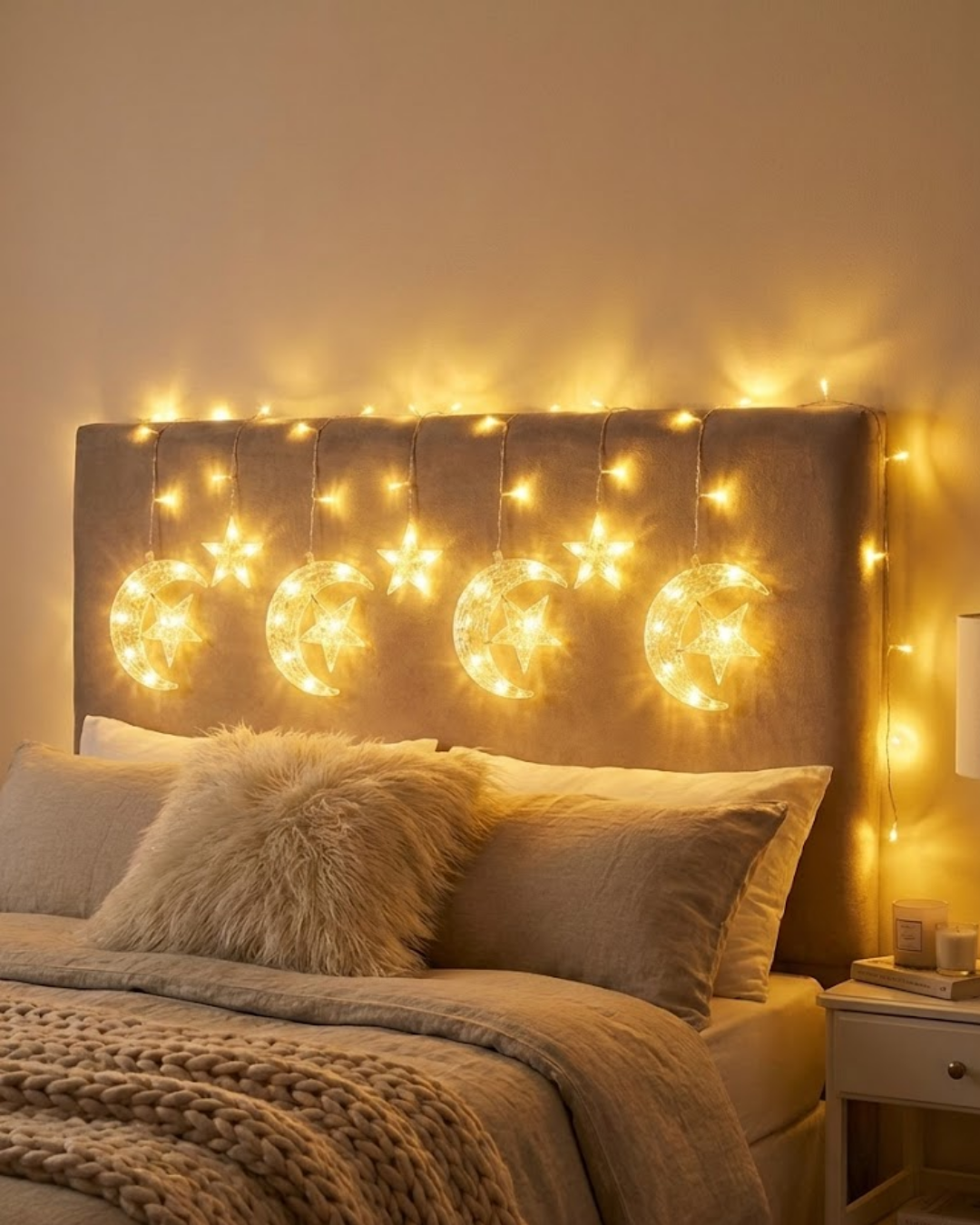 Perde önünde, arka plan dekoru olarak, masa arkası süslemede ya da vitrin tasarımında rahatlıkla kullanılabilir. Işık yandığında hilal ve yıldız figürleri daha belirgin hale gelir ve bulunduğu ortama estetik bir derinlik kazandırır.