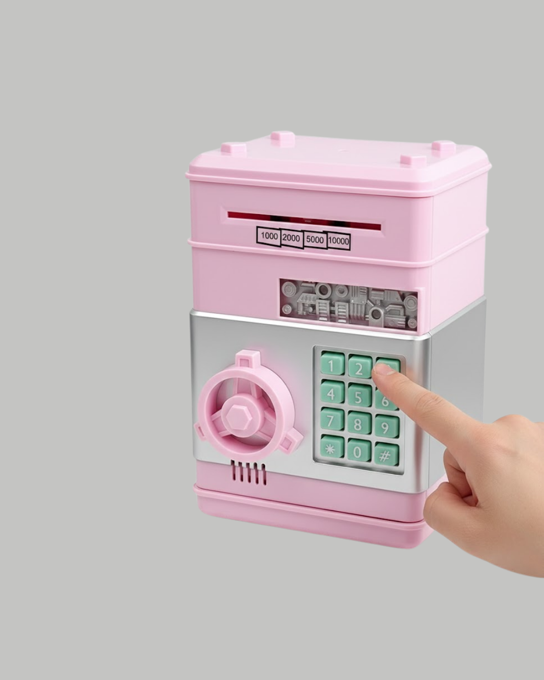 Bu elektronik şifreli kumbara, hem çocuklar hem de yetişkinler için güvenli bir para saklama çözümüdür. Otomatik para çekme mekanizması ve büyük iç hacmi ile öne çıkar.