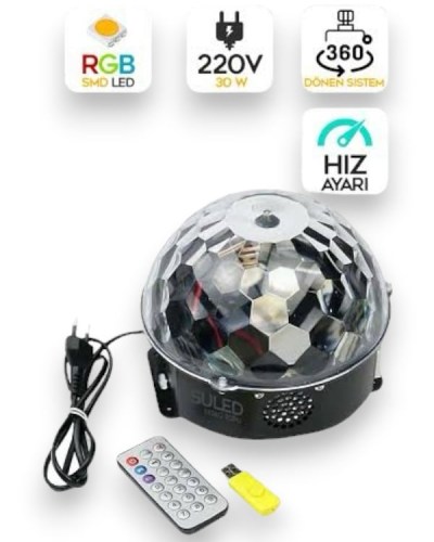 SD Kart ve USB Girişli LED Işıklı Kristal Yarım Küre ile kırmızı, mavi ve yeşil olmak üzere 3 farklı renk kombinasyonu müzik ritmine ayak uyduruyor.