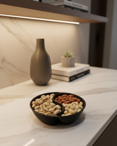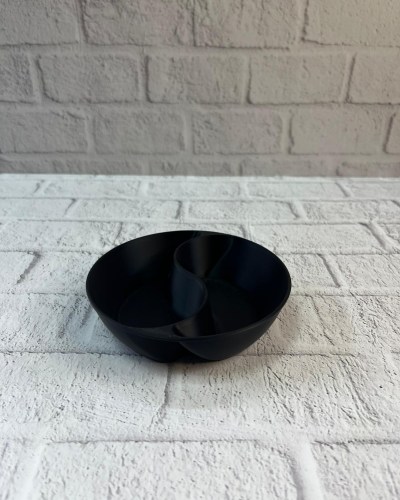 Bölmeli yapısı sayesinde farklı atıştırmalıklar aynı kase içinde düzenli şekilde sunulabilir. Bu özellik, özellikle misafir ağırlarken pratiklik sağlar. Siyah rengi, masa üzerinde sade, modern ve şık bir atmosfer oluşturur.