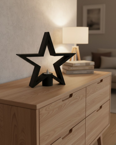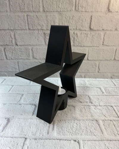 Geometrik yıldız tasarımıyla öne çıkan siyah mumluk, yaşam alanlarınıza modern bir dokunuş katar. Mum yerleşimi sayesinde yumuşak ve huzurlu bir ışık yayarak akşam saatlerinde rahatlatıcı bir ortam sunar. Minimal çizgileri sayesinde İskandinav, modern ve endüstriyel dekorasyon stilleriyle uyumludur. Günlük kullanımın yanı sıra özel gün dekorasyonu için de idealdir.