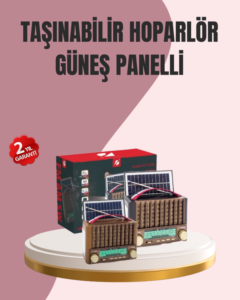 Solar şarj destekli taşınabilir radyo ve hoparlör, retro tasarımıyla dikkat çekerken modern multimedya çözümleriyle fonksiyonel bir kullanım sunar. Üzerindeki solar panel sayesinde güneşten enerji alarak kendi kendine şarj olabilir. Elektrik olmayan ortamlarda büyük kolaylık sağlayarak kamp, doğa yürüyüşü, piknik gibi aktivitelerin vazgeçilmez cihazı hâline gelir.
