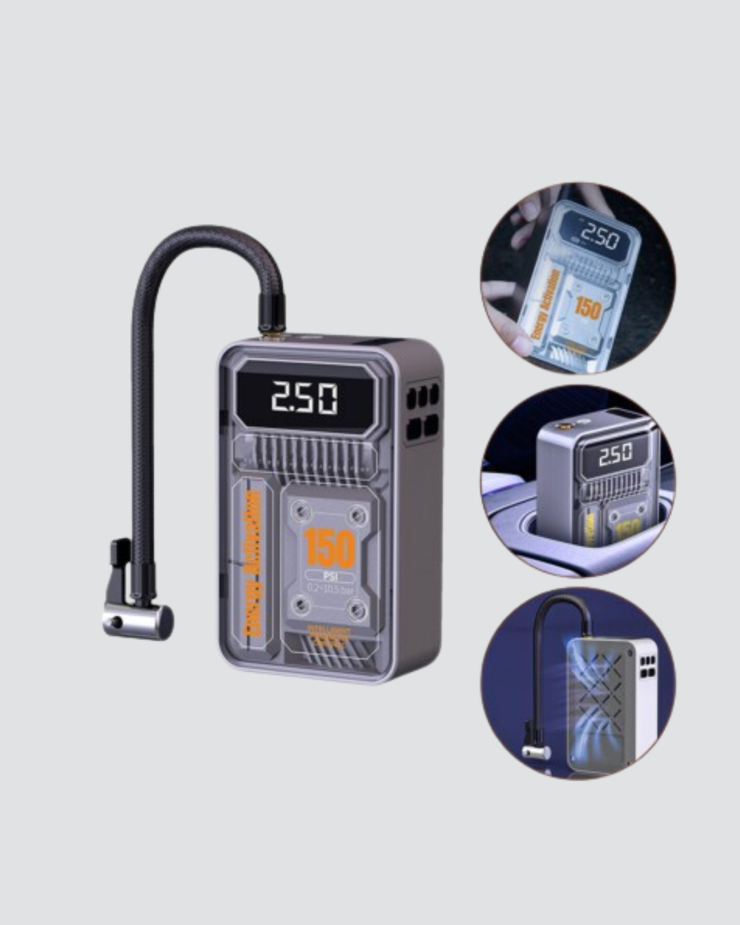 Bu taşınabilir kablosuz hava pompası, 150 PSI basınç gücüyle otomobil, motosiklet, bisiklet ve top gibi farklı ekipmanları kolayca şişirebileceğiniz çok yönlü bir cihazdır. Kompakt yapısı (82x45x134 mm) sayesinde torpido gözüne, çantanıza veya araç kol dayama kutusuna rahatlıkla sığar.