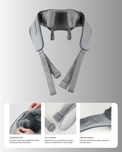 Ergonomik olarak tasarlanmış U şekli, boyun bölgesini tamamen sarar ve cihazın doğru konumda sabit kalmasına yardımcı olur. Ayarlanabilir askıları, farklı vücut tiplerine uyum sağlar ve kullanım sırasında ellerinizi serbest bırakmanıza olanak tanır.
