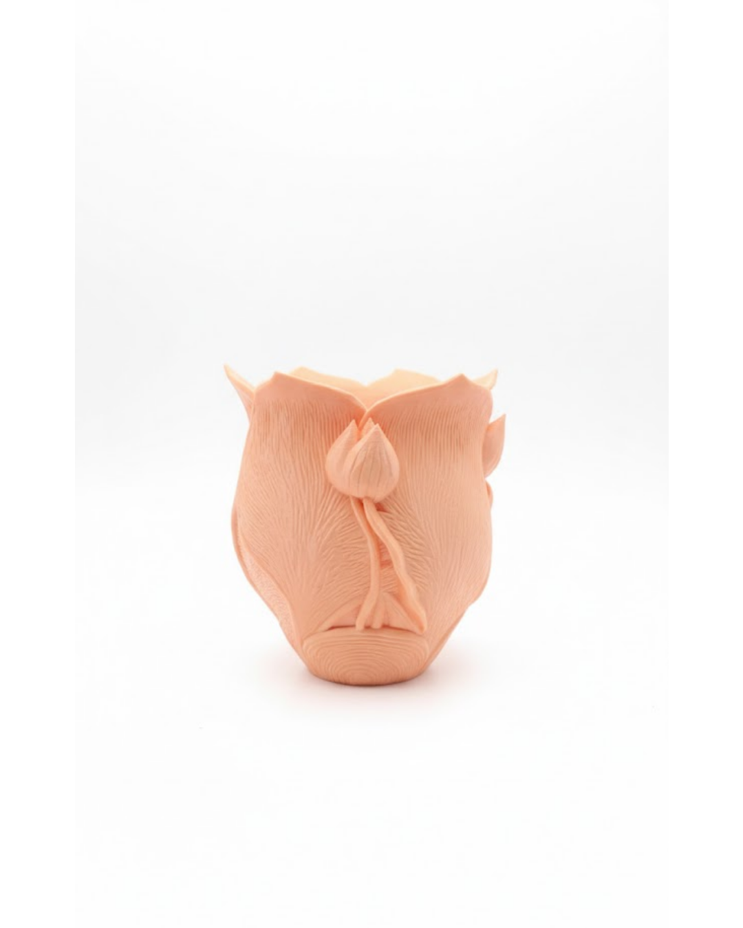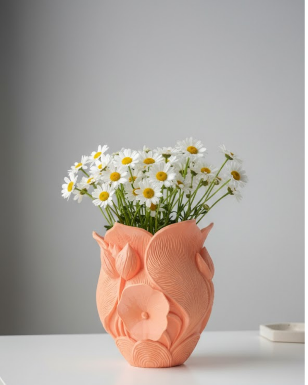 Bu 3D turuncu çiçekli vazo, sanatsal yüzey dokusu ve modern tasarımı ile ev dekorasyonunda şık bir tamamlayıcıdır. Çiçeksiz ya da çiçekli kullanıma uygundur.