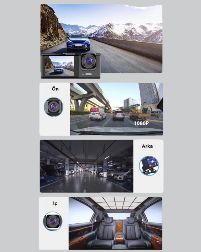 Araç güvenliği için geliştirilen üç kameralı araç kamerası, sürüş sırasında tüm detayları kaydederek olası riskleri en aza indirir. Full HD 1080P ön kamera, HD 720P iç ve arka kameralarla birlikte net görüntüler sunar. Gece görüş özelliği sayesinde karanlık yollarda bile her detayı görmenizi sağlar. 170° geniş açılı lens, kör noktaları ortadan kaldırarak sürüş güvenliğini artırır. G-sensör, ani darbeleri algılar ve kritik anları otomatik olarak kaydedip koruma altına alır. Park halindeyken bile hareket algılama özelliği sayesinde aracınız güvende olur. 2 inçlik ekran, kayıtları kolayca izlemenize imkan tanır. 32 GB Micro SD kart desteğiyle uzun süreli kayıt yapılabilir. Suya ve toza dayanıklı yapısıyla uzun ömürlü kullanım sunar. Kompakt tasarımı sayesinde araç içinde fazla yer kaplamaz. Sürüş güvenliği için ideal olan bu cihaz, kazalarda kanıt niteliği taşıyan kayıtlar yaparak sizi her zaman destekler. Hem şehir içi hem uzun yol sürüşlerinde güvenliğinizi artıran çok yönlü bir çözümdür.