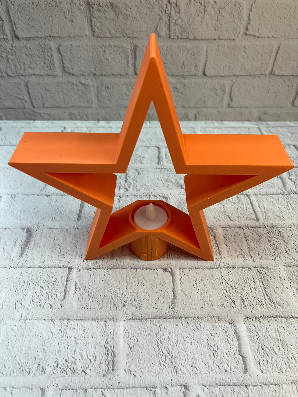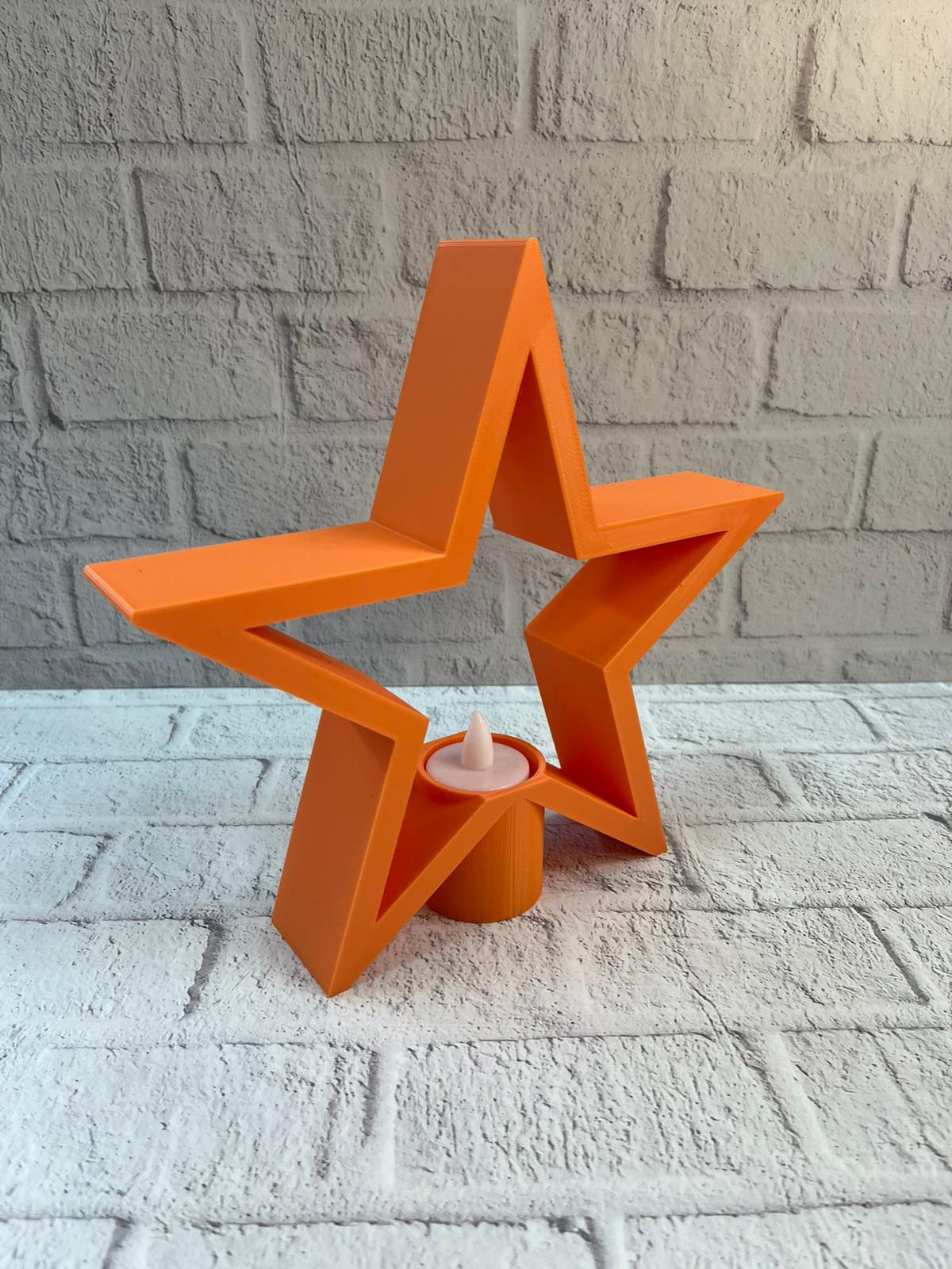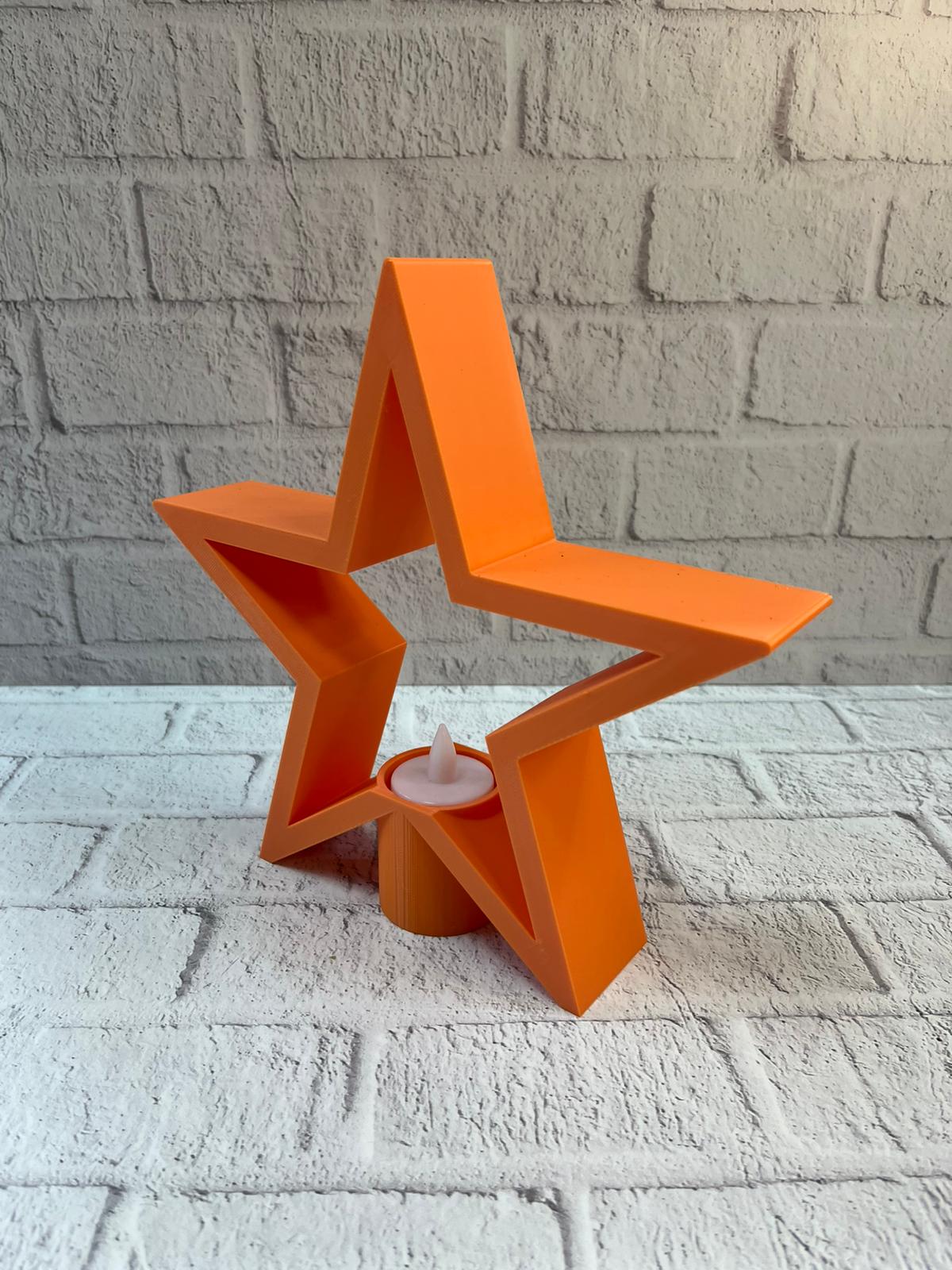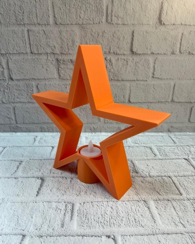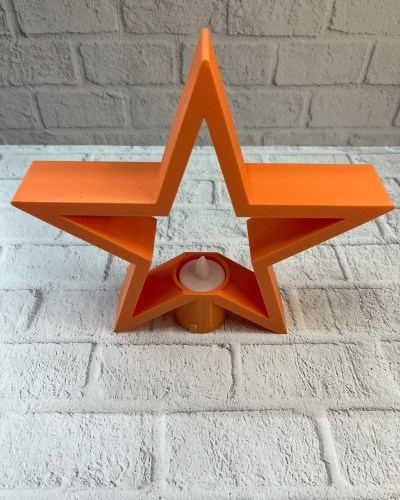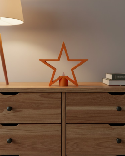 Dekoratif turuncu yıldız mumluk, loş aydınlatma sevenler için estetik ve işlevsel bir ev aksesuarıdır. Raf üstü, masa veya sehpa üzerinde kullanıldığında dekorasyona derinlik ve karakter kazandırır. Mum ışığının yumuşak yansımasıyla salonlarda cozy bir ambiyans oluşturur ve mekâna sıcak bir dokunuş ekler.