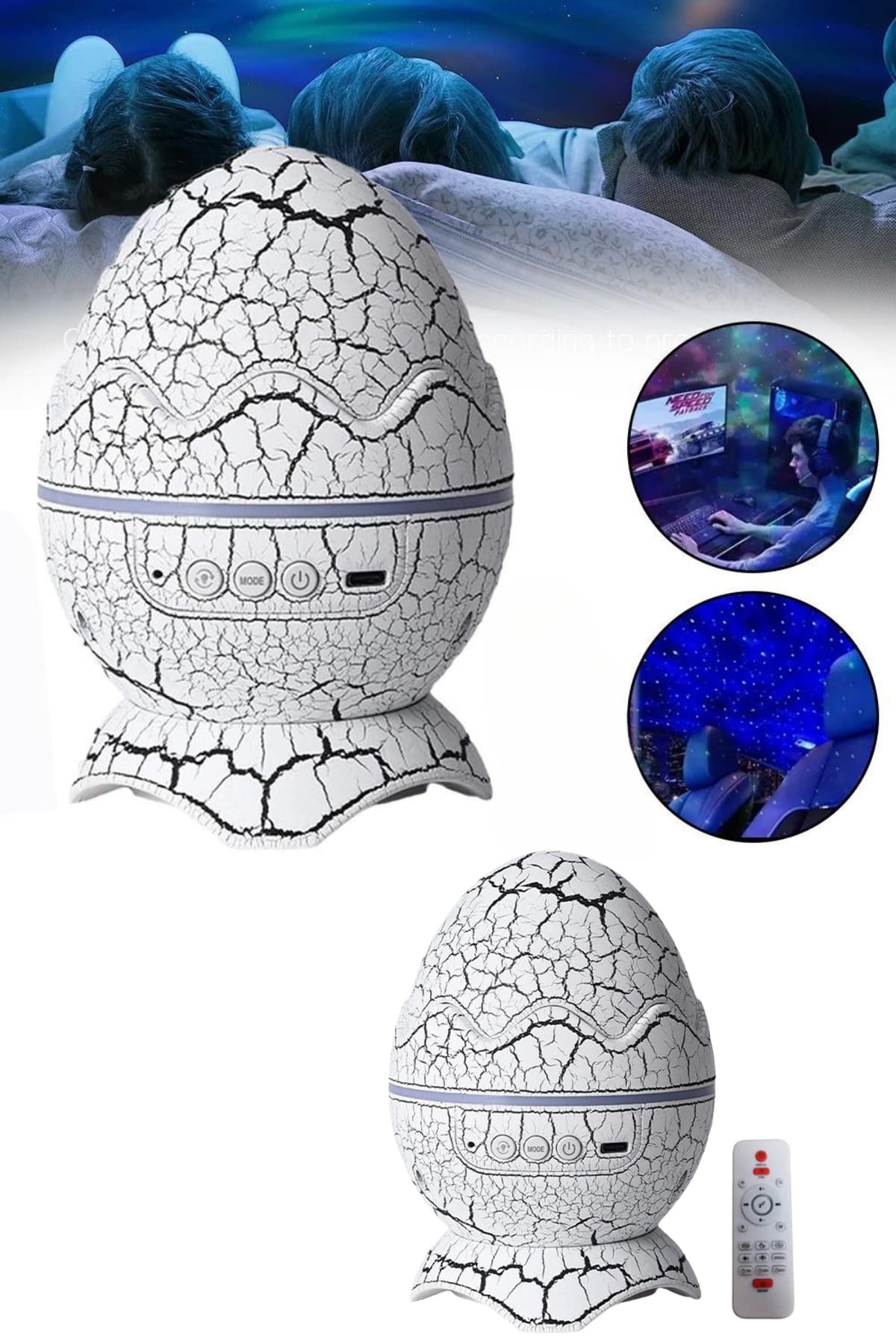 Evdeki her ortamı büyülü bir atmosfere dönüştürmek artık çok kolay! Dinazor Yumurtası tasarımı, odanızı kocaman bir uzay alanına çevirebilmenizi sağlar. Yıldızlarla dolu bir gökyüzüne bakarak, hayal gücünüzü özgür bırakabilirsiniz. Ürünün şık ve ilgi çekici tasarımı, sadece işlevsel değil, aynı zamanda evinize görsel olarak da zarif bir dokunuş ekler. Sadece bir düğmeye basarak, dönen projektörün sağladığı 7 farklı sis türü ve farklı hız ve parlaklık ayarlarıyla ışık gösterisinin keyfini çıkarabilirsiniz.